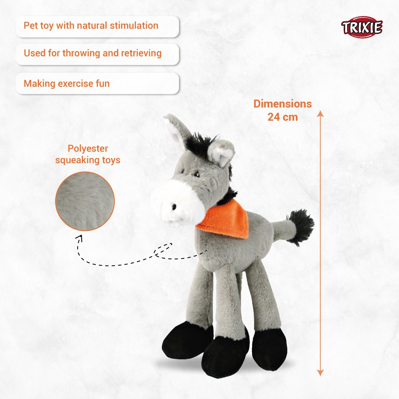 - Trixie Donkey Plush is made using things dogs will love: brightly colored fabrics and squeaker which mimics small preys and entices them to play.
