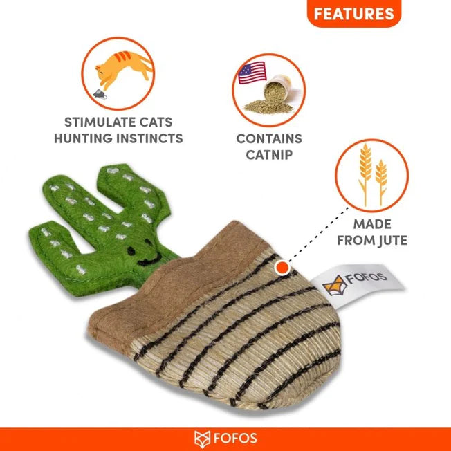 Fofos cactus toys are cute cat-playing toys filled with imported US-grade catnip dried leaves and grass powder. The interactive toys allows your cat to chew, swat, nip, play, and even promotes harmless biting and scratching. Fun engaging cat toys give your cat a mouse chase-like feeling ensuring good physical stimulation while the catnips give them a calm and relaxing experience. Ideal for small pet kittens above 6 months of age as well as for older cats of Persian and other breeds as well.