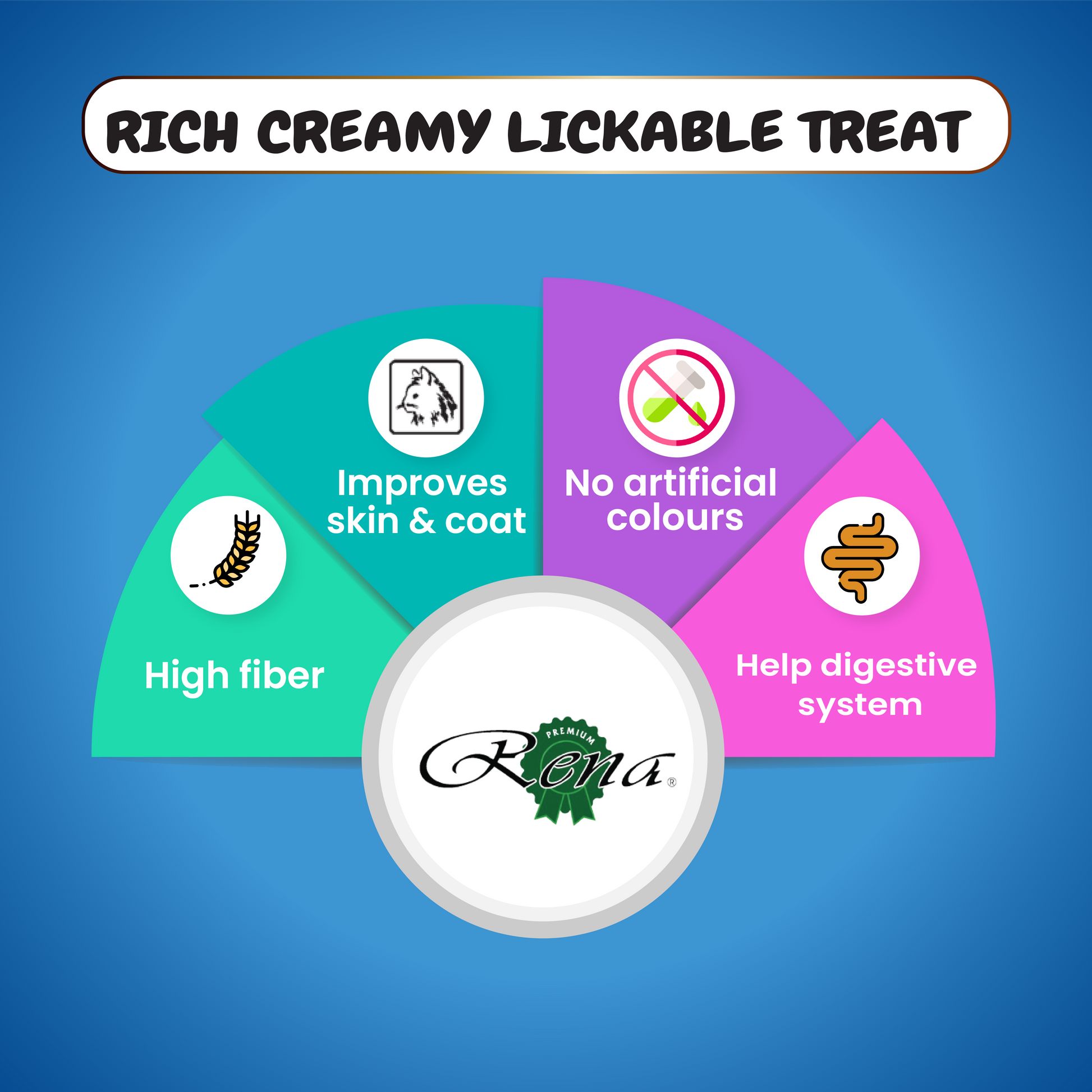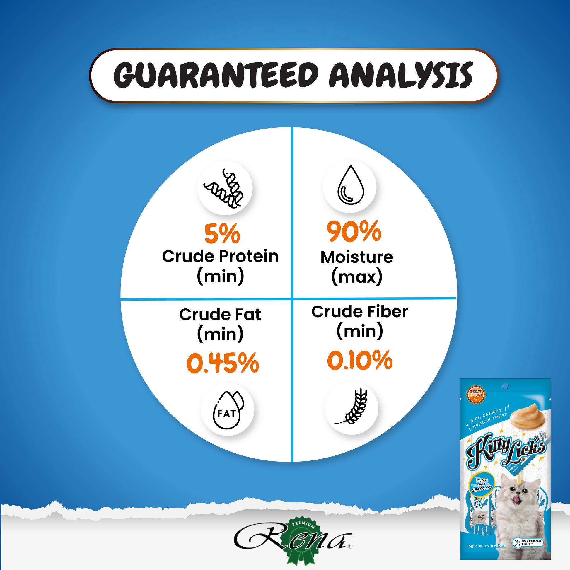 Rena's Recipe Kitty Licks Tuna With Seafood Kitten Treat for all breeds. Made in Thailand. Rich Creamy, Lickable Treat. Tuna with Seafood Flavor. No artificial colors used.
